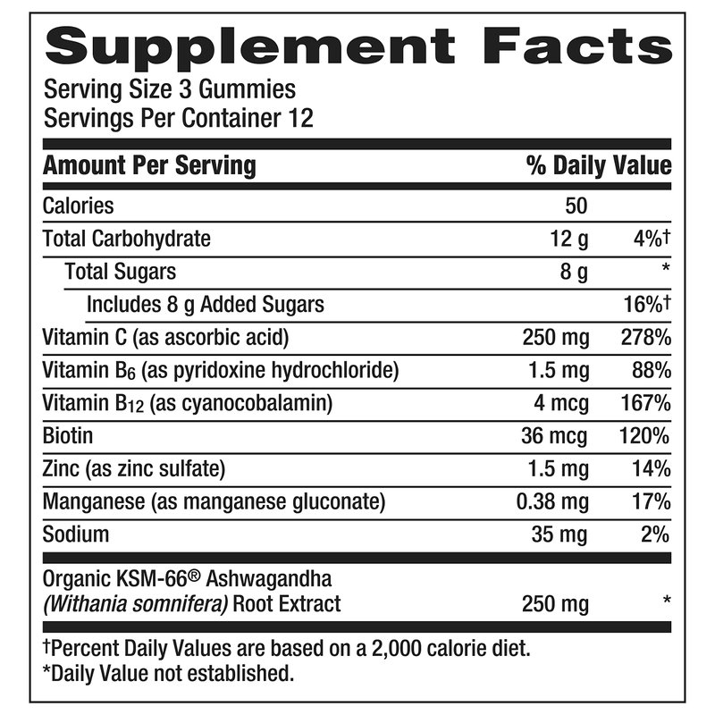 - 36 count bottle of berry blend flavored Emergen-C Ashwagandha and 250mg Vitamin C Per 3 Gummies, Dietary Supplement