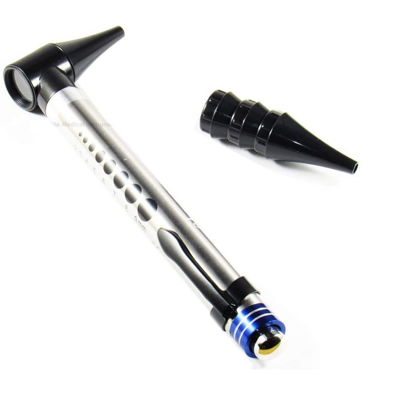Elite Medical Instruments EOM-955 LED Otoscope. Good for home use, medical students, and nurses. Great otoscope for those on a budget. Comes with click button trigger to activate the light source. Comes with a reusable speculum and two AAA batteries. Otoscope also includes penlight conversion attachment. Otoscope has a LED light source. Includes carrying case.