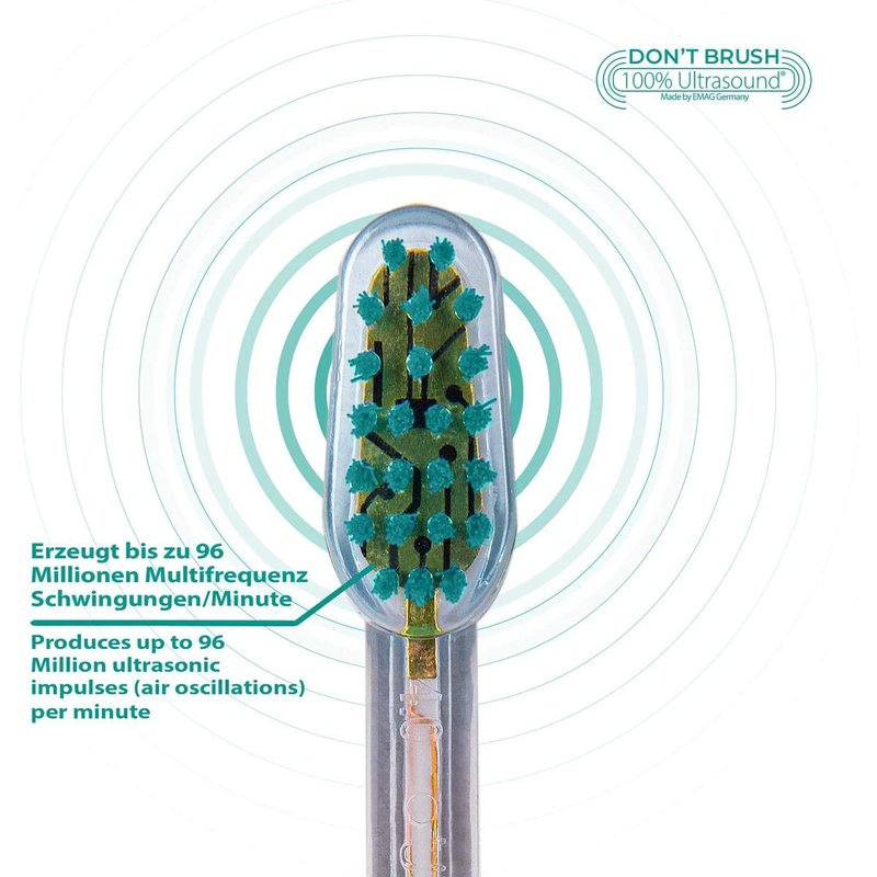 - WAVE, DON’T BRUSH: Emmi-dent changes the way you clean your teeth with innovative ultrasound technology. Just hold & wave the electric toothbrush head over teeth & gums to let the ULTRASOUND Waves do the cleaning – not the bristles. Our patented Piezo-chip technology embedded inside the brush-head create ultrasound waves. The bristles serve as antennas to deliver targeted waves directly onto teeth and gums. No brushing, no vibrations, no unpleasant sensations for a most gentle cleaning action.