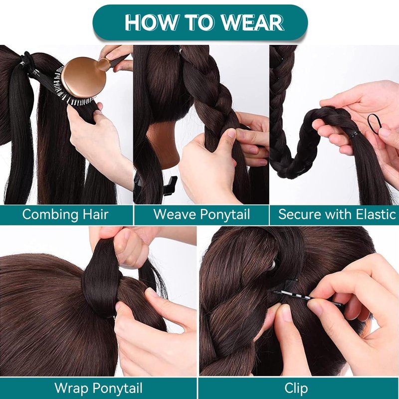 - 💕How to Apply :1.Tie your hair into a ponytail. Then, tie the braided ponytail around your pony. 2.Separate shorter synthetic hair piece from longer ones. Split your hair into 3 sections and braid it with the synthetic hair. 3.Secure braid with clear elastic & wrap the hair piece around. 4.Secure it with bobby pins.