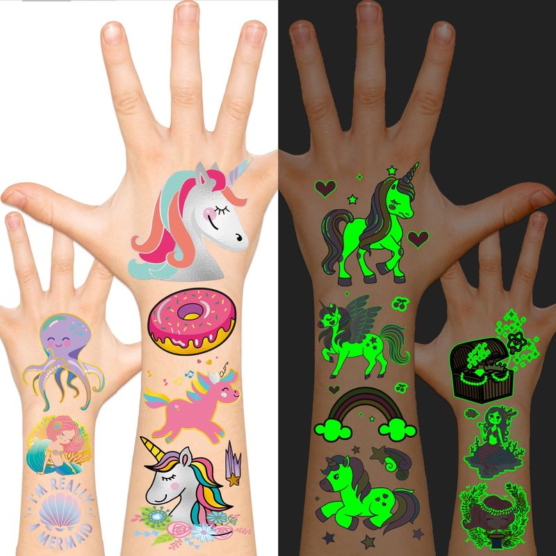 - 【Long Lasting and Waterproof】Our metallic glow temporary tattoos for kids are designed to be waterproof, ensuring they won't fade away unless deliberately rubbed off. These tattoos can withstand everyday activities like sweating, bathing, and swimming without losing their color or design.