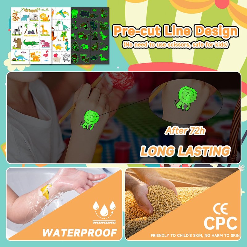 - 【Long Lasting and Waterproof】Our metallic glow temporary tattoos for kids are designed to be waterproof, ensuring they won't fade away unless deliberately rubbed off. These tattoos can withstand everyday activities like sweating, bathing, and swimming without losing their color or design.