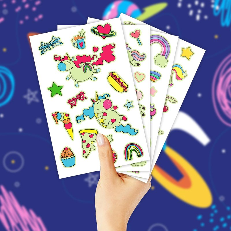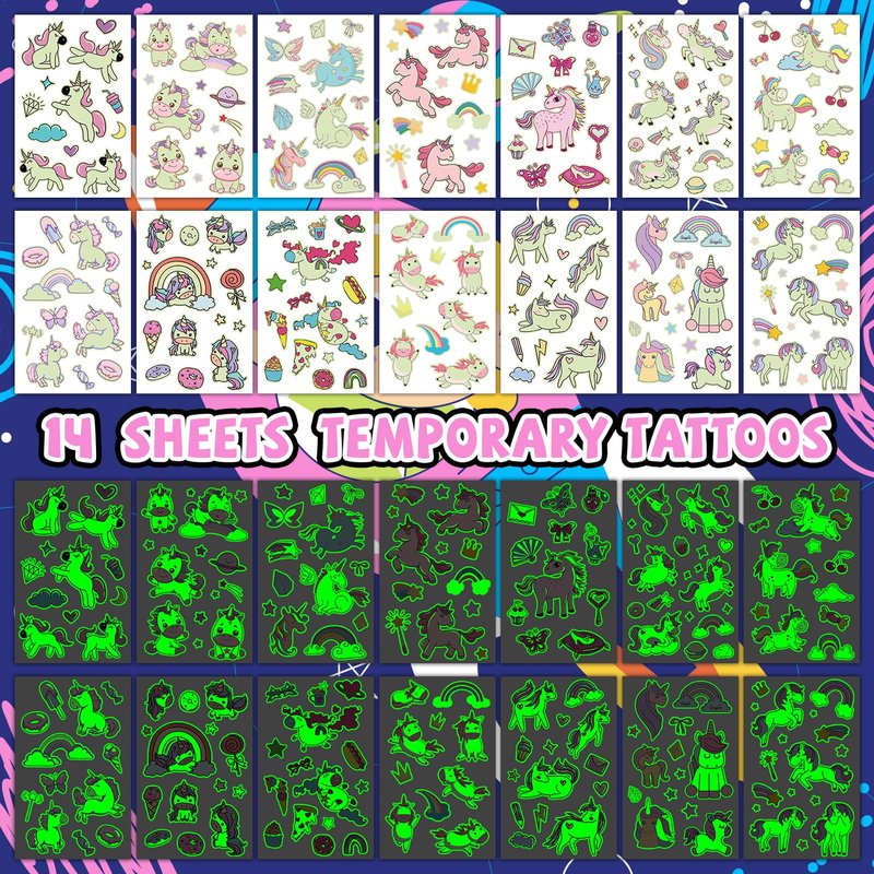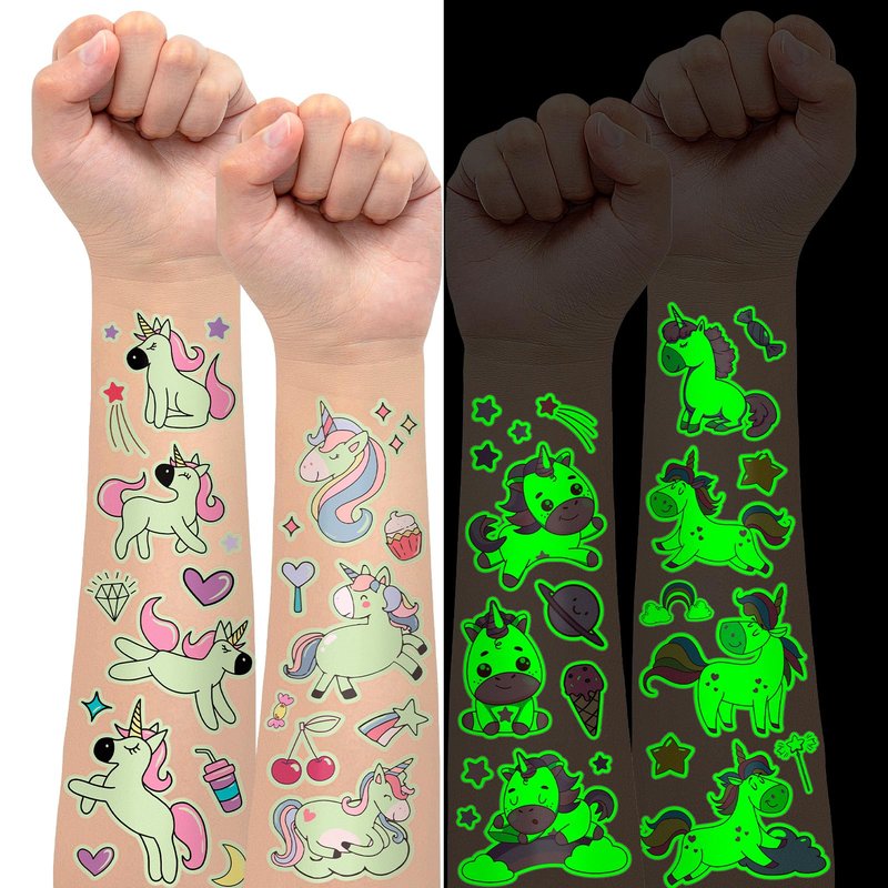 - 【Glow In Night Tattoos】Add a touch of magic to your child's day with our glow tattoo stickers! The luminosity of the tattoos is light-dependent; the more light they absorb, the more brilliantly they shine in the dark. These kid-friendly tattoos are versatile and can be applied to hands, arms, faces, or any smooth surface, making them the perfect addition to any imaginative playtime or special celebration.