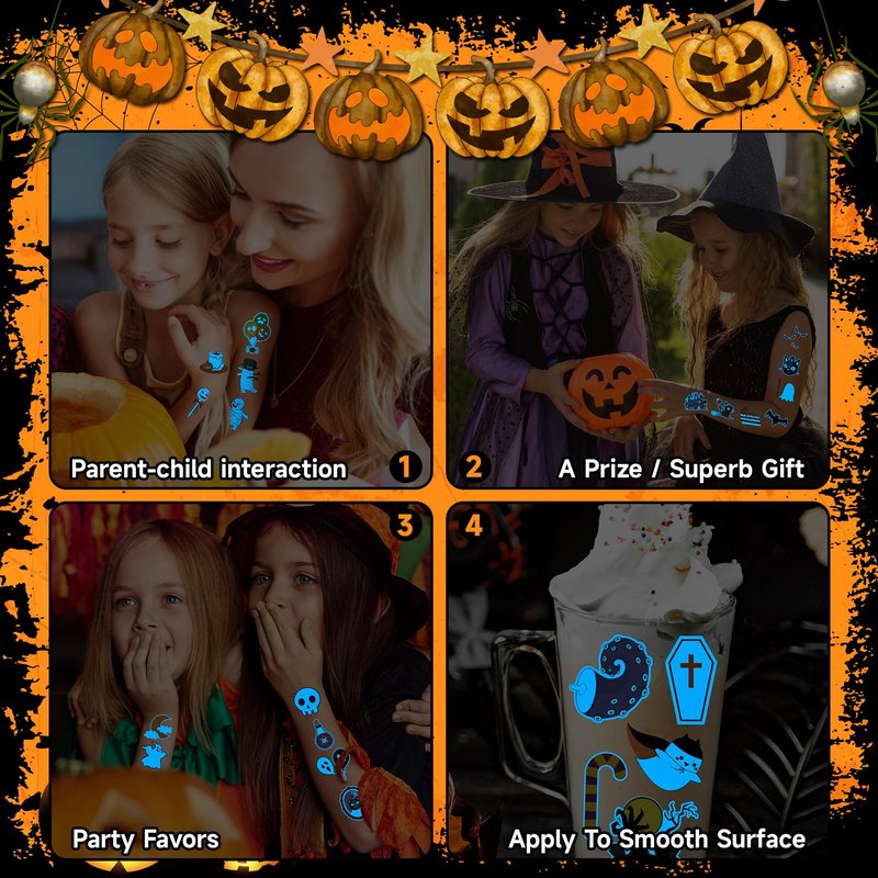 - 【Halloween Glows Tattoos】Step into the night with our Halloween Glows Tattoos, designed to add a magical touch to your child's Halloween festivities! These unique tattoos stand out from the rest, glowing with an enchanting blue light in the dark, creating a mystical ambiance at any Halloween party. And the luminosity time is influenced by light, The more light is absorbed, the brighter it becomes.A Nighttime Surprise for Kids!!!