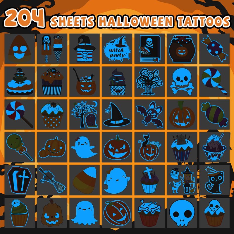 - 【Halloween Temporary Tattoos for Kids】Elevate your child's Halloween experience with our Glowing Halloween Temporary Tattoos! Choose from an extensive collection of 204 designs, including pumpkin buckets, fake bats, mini hand bones, and more, your child will love showing off their spooky style.