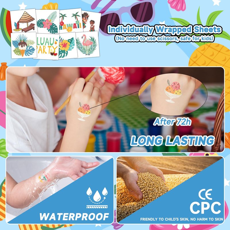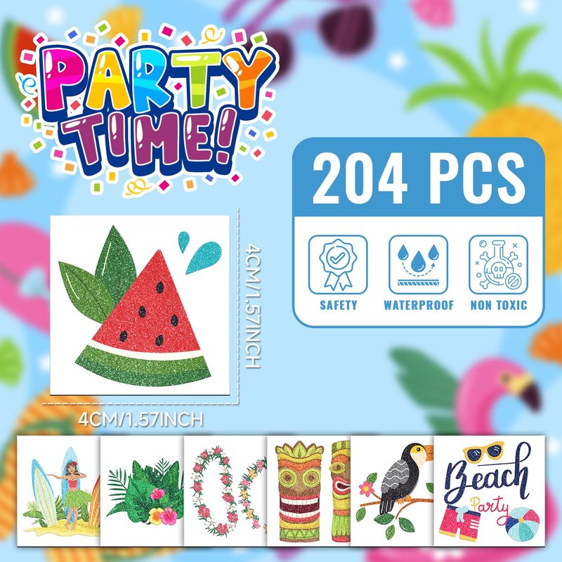 - 【Hawaiian Luau Pool Beach Birthday Party Supplies】204 individually wrapped sheets of Hawaiian Luau Beach temporary tattoo stickers have various cartoon-themed characters. There is no need for scissors to cut, it’s safer for kids.