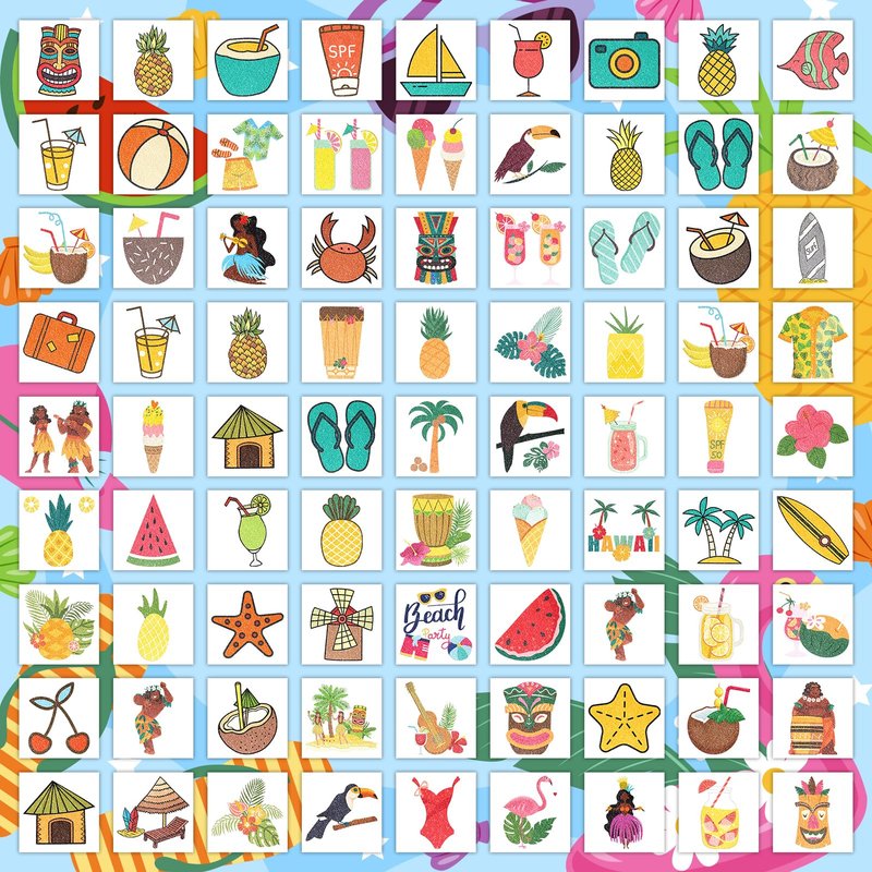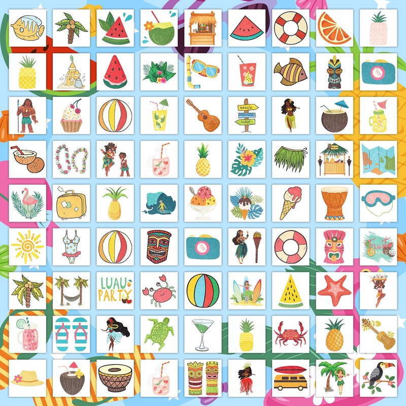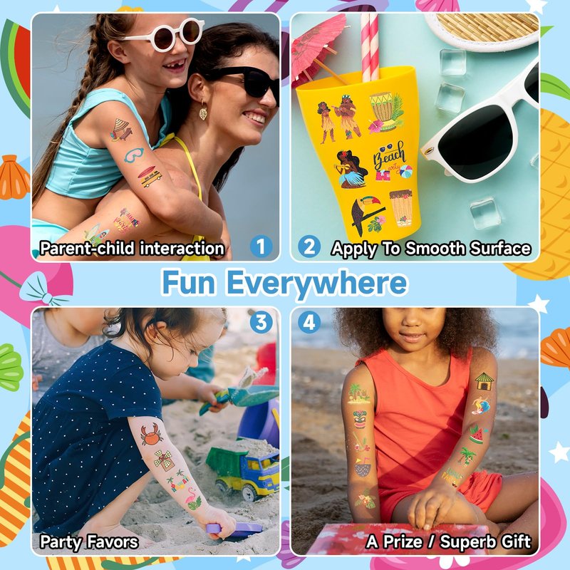 - 【Multiple Patterns With Cool Luau Design】This kind of kids tattoo has rich beach elements like surfboards, beach chairs, swimming rings, coconut groves, bikinis, ice cream, flip flops, and more. It will be great fun for kids to play at the pool and beach.