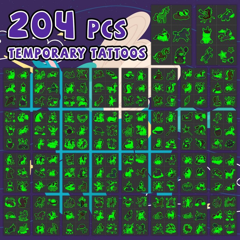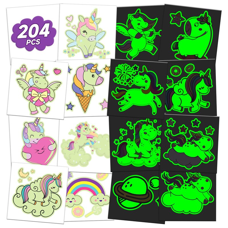 - 【Glows Temporary Tattoos Girls】204 Sheets glows tattoos for kids, these cute temporary tattoos will glows with a cool appearance and luminosity time will be affected by light and temperature, the more light it absorbs, the brighter it shines at night. Our kids temporary tattoos are an exciting choice that will elevate the fun at your gatherings.