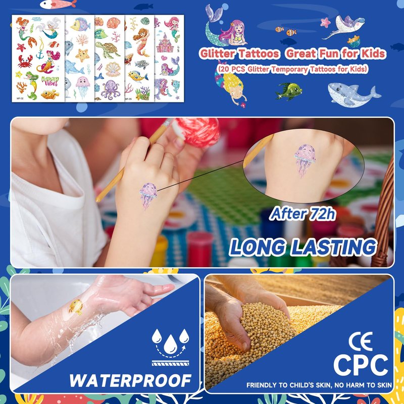 sea animal and mermaid glitter tattoos for kids with 20 sheets