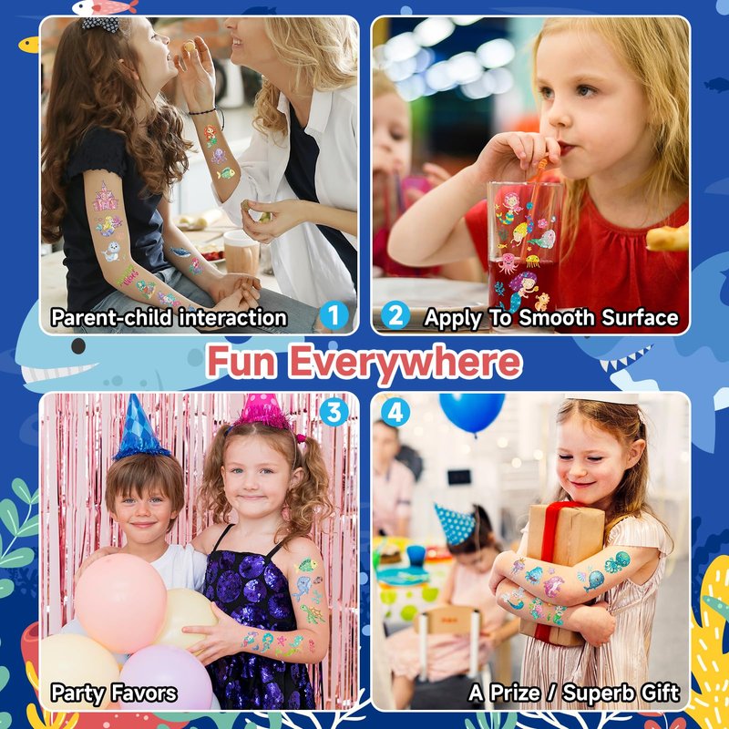- 【Glitter Ocean Themed Mermaids Temporary Tattoos】These sea creature tattoo stickers are made of pink glitter. Manufactured using a special process that allows it to glitter in the sunlight. Great birthday party gift for kids, also can be shared as a gift to your own family and friends. They can add more fun to girls' birthday party games and activities!
