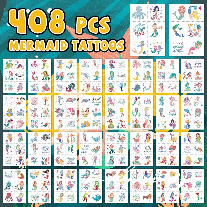 - 【Mermaid Temporary Tattoos for Girls】This collection offers an impressive 408 sheets of unique, patterned temporary tattoos, designed especially for girls. Featuring a vibrant and colorful array of mermaid-themed designs such as mermaids, starfish, seaweed, shells, and octopuses—characters that are sure to be a hit with little girls. With a vast selection and diverse styles, these tattoos provide ample options for children to share with their friends at the party.