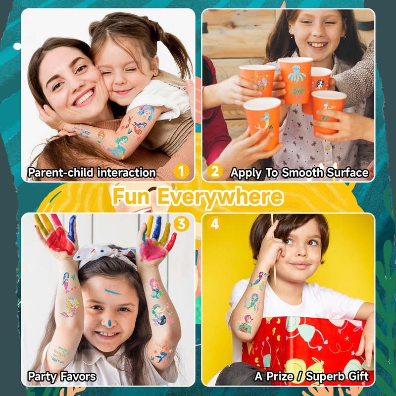 - 【Unique Crafted Design】Glitter Mermaid tattoo stickers are specially adorned with a dazzling design, elevating the sparkle and delicacy of each tattoo. Individually sectioned for convenience, these tattoos are perfectly sized to adorn kids' arms, hands, or any other spot. They serve as fantastic gadgets for children, ensuring that your little one shines brightly at the party, turning heads with their enchanting, glittery accents.