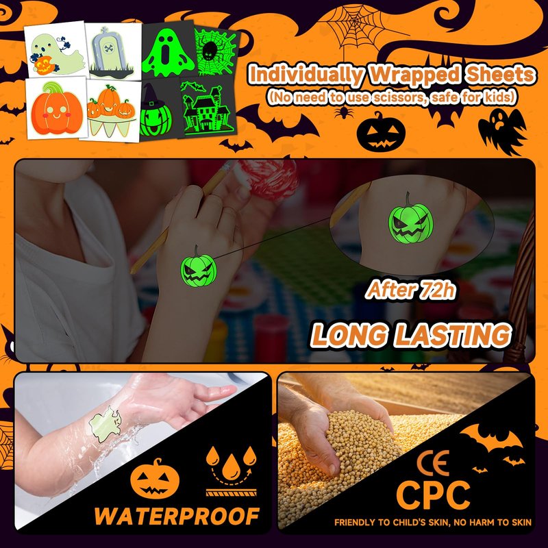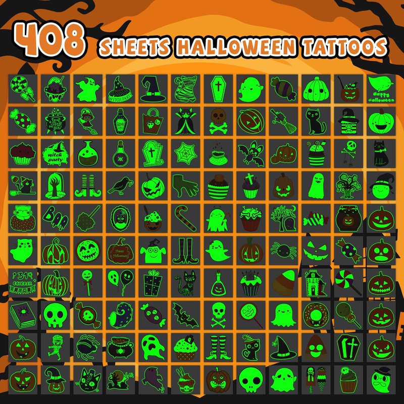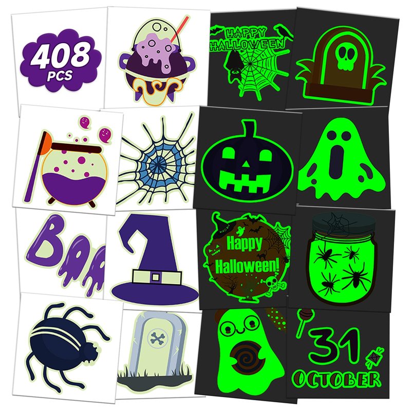 - 【Individually Wrapped Glows Tattoos】Rich and glows Halloween tattoos for kids were individually wrapped, easy to carry, and don't need scissors to cut, it's safe for kids to use. This Halloween tattoo set comes with 408 unique, high-quality, luminous tattoos that are suitable for Halloween enthusiasts looking to add a touch of spook to their costumes.