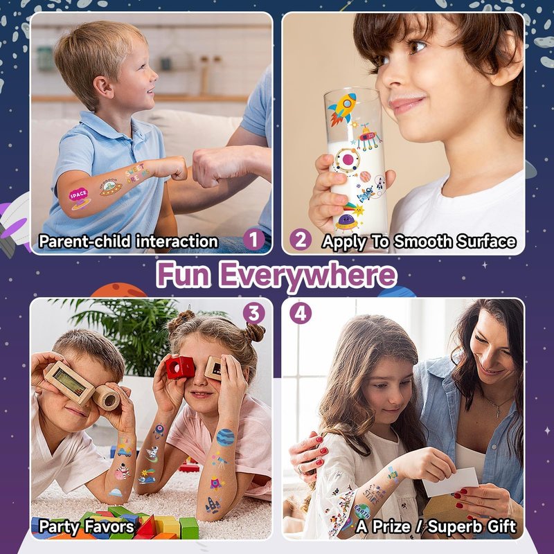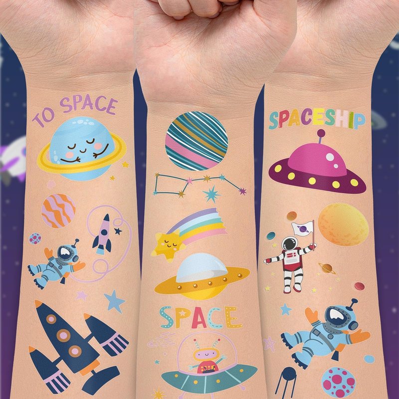 - 【Applicable Place】These space tattoos are suitable for outer space party supplies, party favors, astronaut birthday party decorations, games, goodie bag stuffers, toys, etc. These tattoo stickers can also be used for smooth items, like children’s toys, glass, cups, stationery, phone cases, plastic, boxes, toy cars, and more!