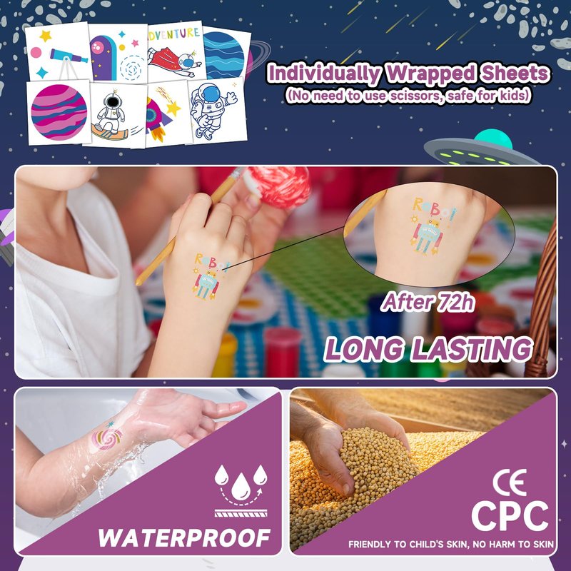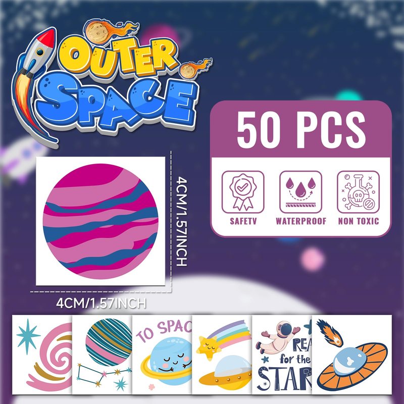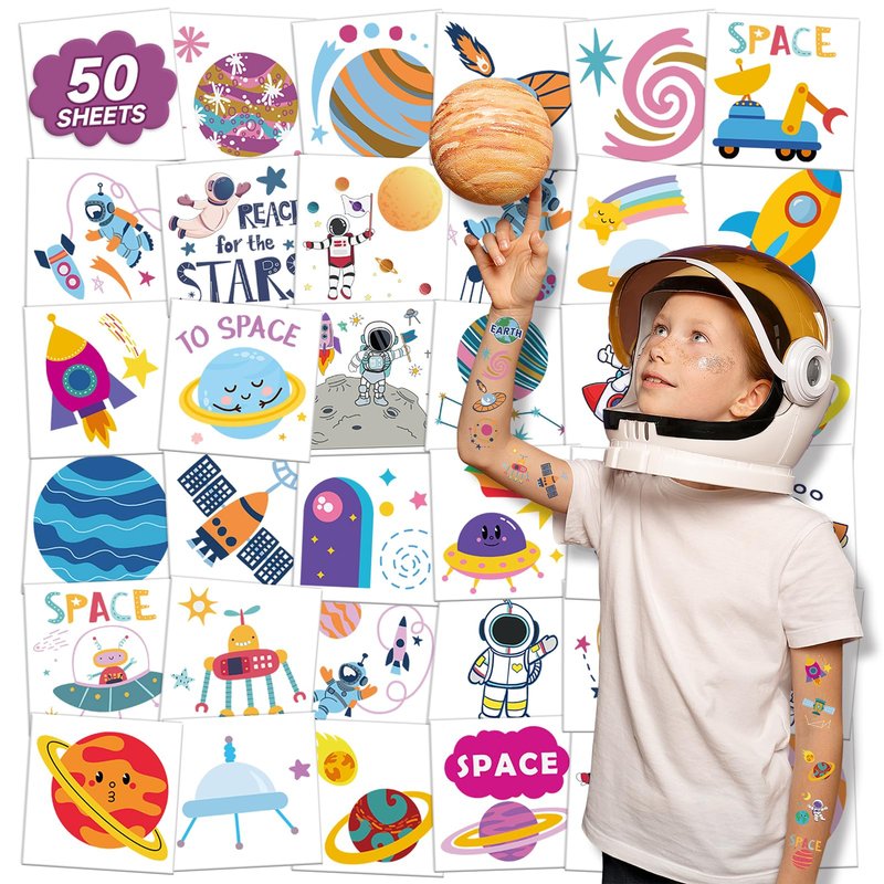 - 【Individually Wrapped Sheets No Need to Cut】50 sheets of space tattoos individually wrapped to be easily included in a party goodie bag. It’s very convenient for kids even if you are at mass people's parties, you can have a different tattoo from others. These pretty and attractive tattoo stickers will keep you and your little ones, and their friends more beautiful. Great for sapce birthday decorations, and ocean animals parties.