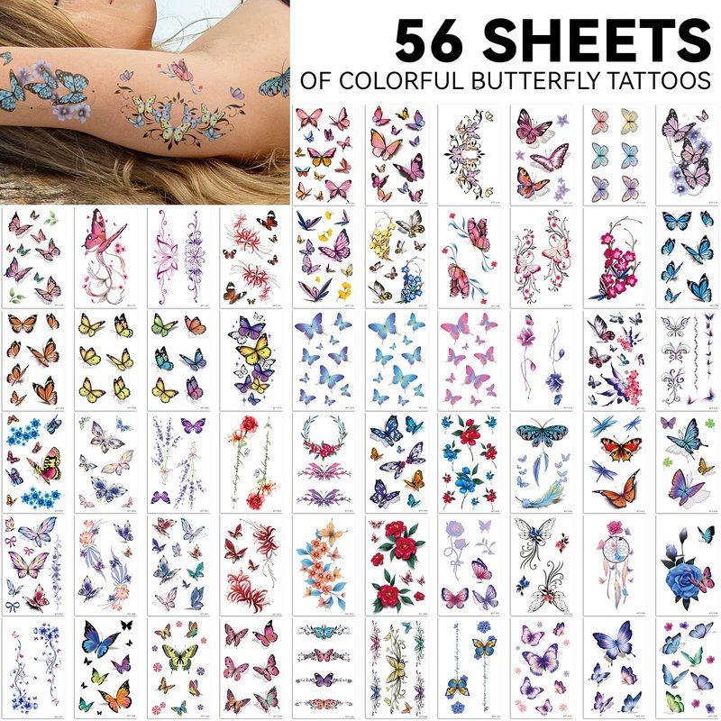 - 【You Will Get】112 sheets in total, 56 sheets of colorful butterfly tattoos, and 56 sheets of black butterfly stickers. These butterfly temporary tattoos are painted in many stylish designs and styles and are popular among peers. You can use these fashionable butterfly stickers to do any combination to show your beauty and confidence, like being stuck on the arm, neck, shoulders, back, legs, ankle, hand, and any other part of your body.