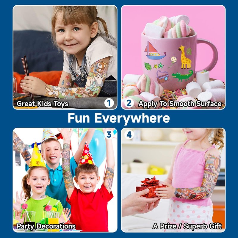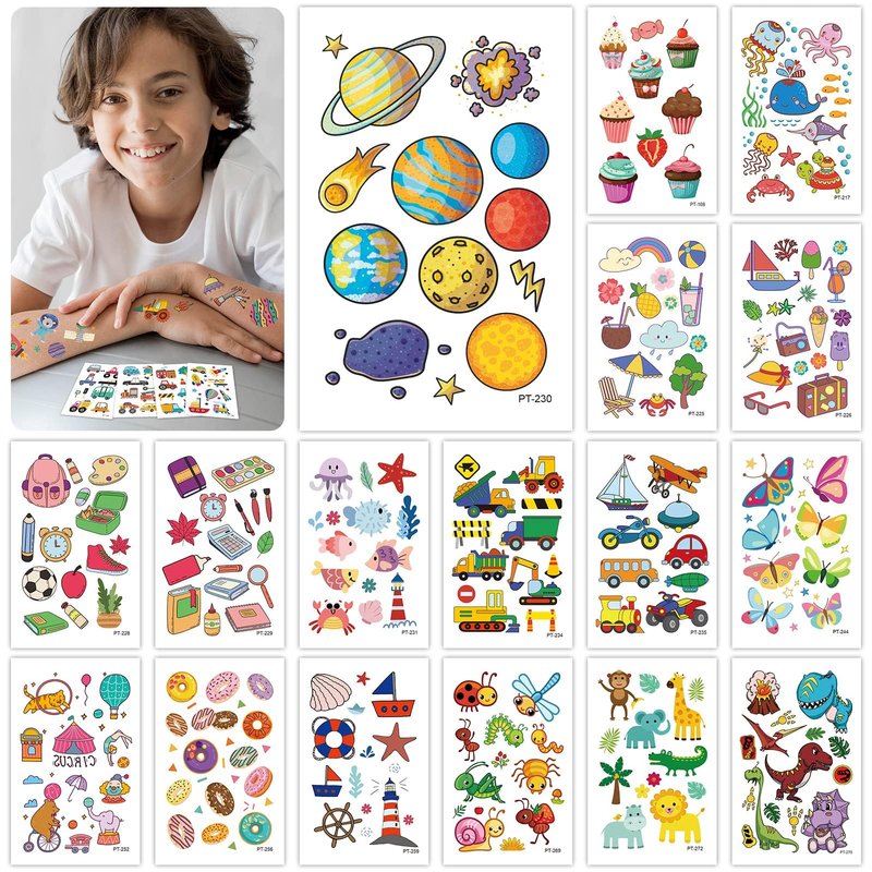- 【Wide Application】Kids temporary tattoos are suitable for kids' party favors, birthday party supplies decorations, school carnivals, kids' goodie bag stuffers, rewards, or surprise gifts! And kids' tattoos can be applied to hands, arms, or some smooth object, such as a bottle, gift box, glass, etc.