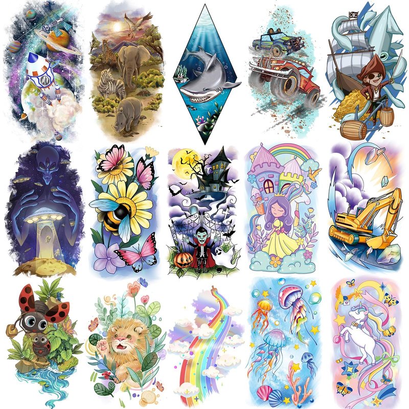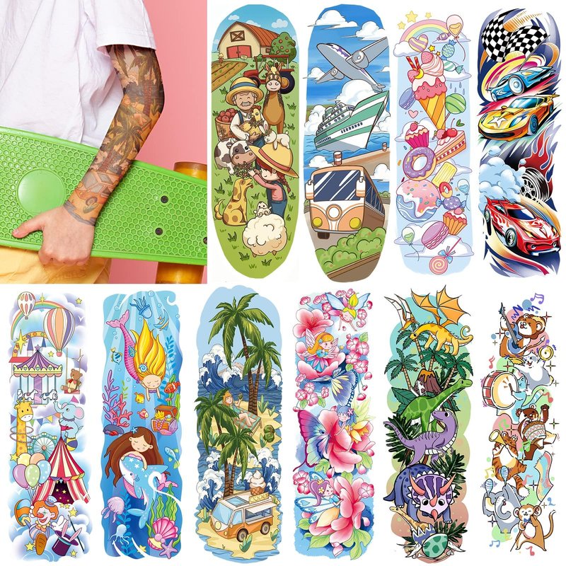 - 【You Will Get】66 sheets temporary tattoos for kids, 10 sheets full sleeve temporary tattoos,15 sheets half arm tattoo sleeves for kids,41 sheets mix styles kids tattoos, rich in elements like mermaid, donut, space, car, truck, animal, and more, different sizes, no repeat patterns, to meet your kids' various needs, let kids enjoy stickers fun!