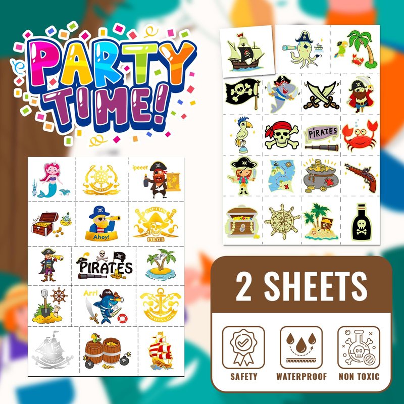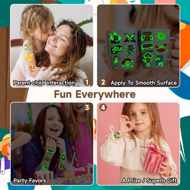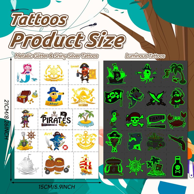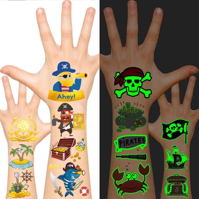 EMOME Glow + Metallic Temporary Tattoos for kids, Waterproof Pre-cut Tattoo Stickers, Birthday Girl Boy Party Favors Supplies Accessories (Pirate)