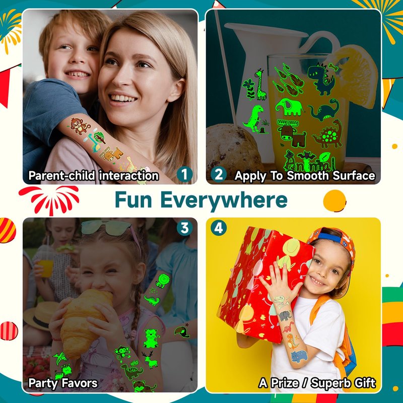 - 【Wonderful Party Supplies】 These enchanting temporary tattoos for kids not only delight with their night-glowing feature but also captivate children of all ages. They serve as an excellent choice for personal decoration or as delightful additions to goodie bags and party favor bags. Elevate the fun and create a festive ambiance at a child's birthday celebration with these glowing tattoos.