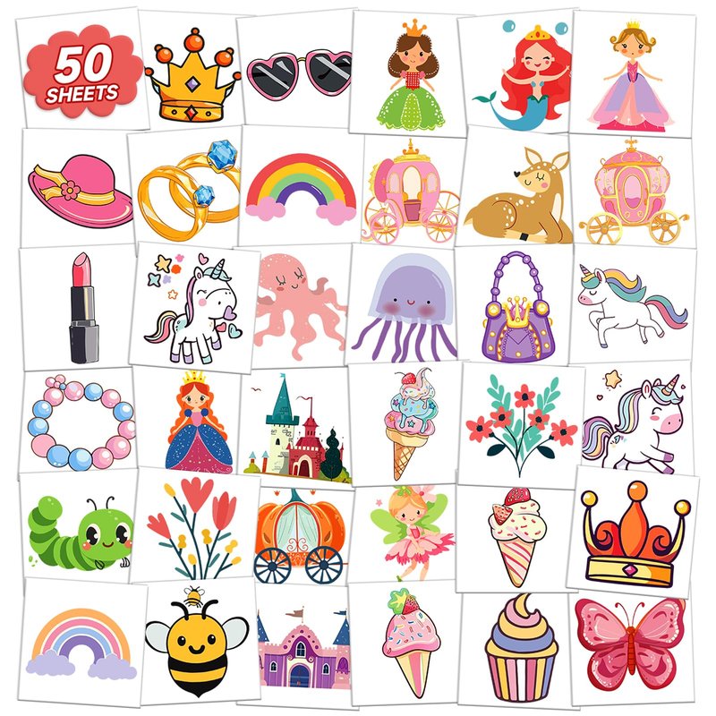 - 【Temporary Tattoos for Girls】50Pcs Individual Wrapped temporary tattoos with various designs tattoo stickers for girls' favor, assorted princess castles, fairy, rainbows, fruits and vegetables, butterflies, mermaids, and other cute animals. Little girls deeply love fake tattoos, and they are great fun for a girl's party favors or a girl's birthday party decorations.