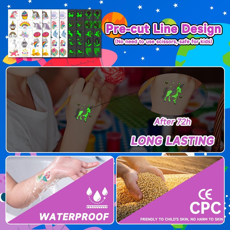 - 【Metallic + Glow Tattoos for Kids】Temporary tattoos are a hit with kids. Each set features 8 sheets, 4 tattoo stickers adorned with metallic glitter elements, and 4 tattoo stickers with glow elements, designed with a variety of styles to appeal to both boys and girls. These tattoos are kid-friendly and measure 7.26 inches * 5.9 inches.