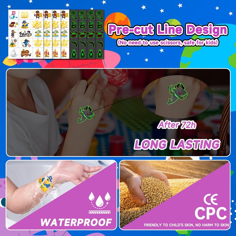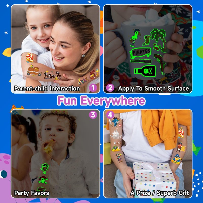EMOME Temporary Tattoo - Glow + Metallic Glitter Style Tattoos for Kids Party Supplies, Temp Tattoos Sticker for Boys Girls, Birthday Party Favor Decorations Accessories (Pirate)