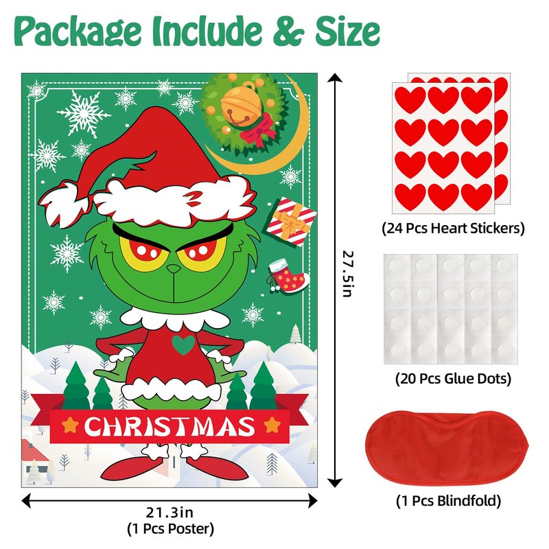 - 🎄【PACKAGE INCLUDE】: 1*Poster, 1*Blindfold, 24*Heart Stickers, 20*Glue Dots.