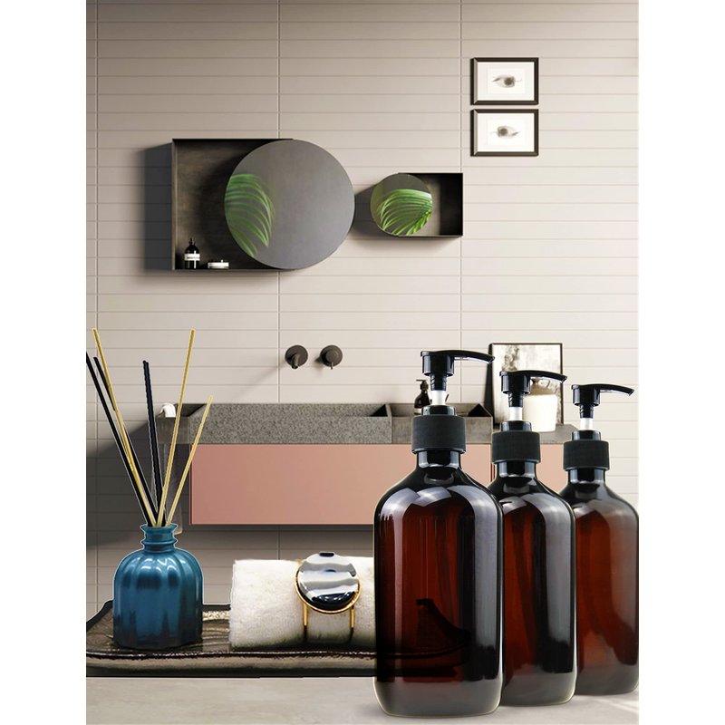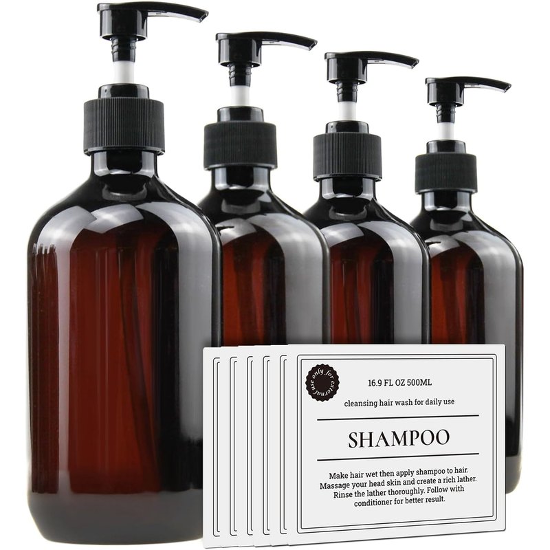 Empty Plastic Bottles with Pump Dispenser and Labels Included, Refillable Travel Containers for Hand sanitizer Shampoo Lotion, etc - BPA/Paraben Free, 500ml/16.9oz (Amber, 4 Pack)