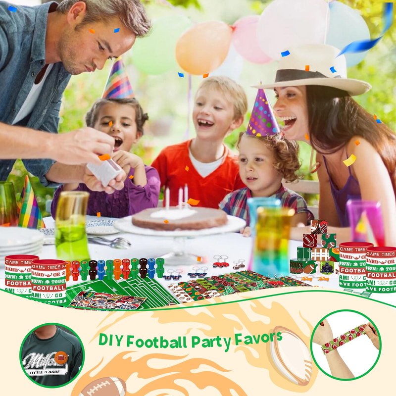 - Large Quantity Football Party Favors: You will receive 244 pieces of football party favors including 24 pcs football stamps, 24 pcs football keychains, 24 pcs football rubber bracelets, 24 pcs slap bracelets, 24 pcs football badges, 24 pcs goodie bags and 100 pcs football themed stickers, enough quantity and styles for your football birthday party favor, meet your daily use.