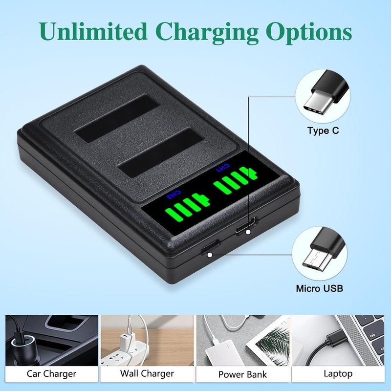 - [Dual Battery Charger] DC 5V/2A charging current, super fast battery charger. Dual battery charger design is convenient to charge 2 batteries simultaneously, and each charging slot works independently, saving your time, saving your batteries' life