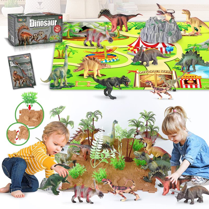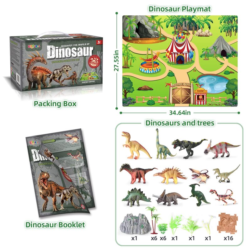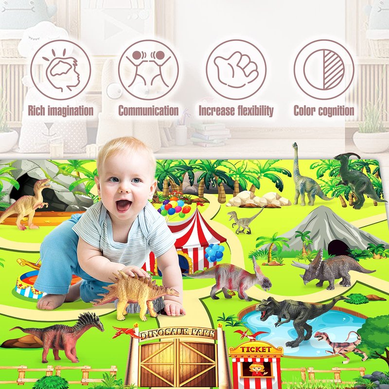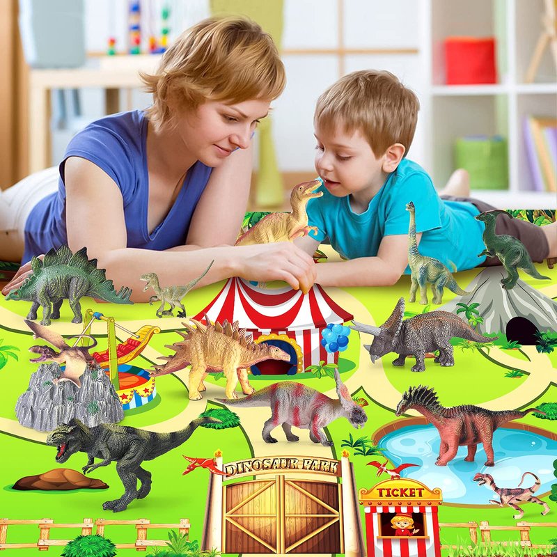 - 🌴 Dinosaur Park Activity Play Mat for Kids: Besides the dinosaur figures and dino booklet that a good toy should have, our dinosaur play mat is made from durable and thick non-woven fabric, which is easy to fold to save space. The pattern of the play mat shows a colorful and fun dinosaur park. Its dimensions are 34.64” X 27.55”, large enough for 2 to 3 kids to play together and have a happy dinosaur adventure time.