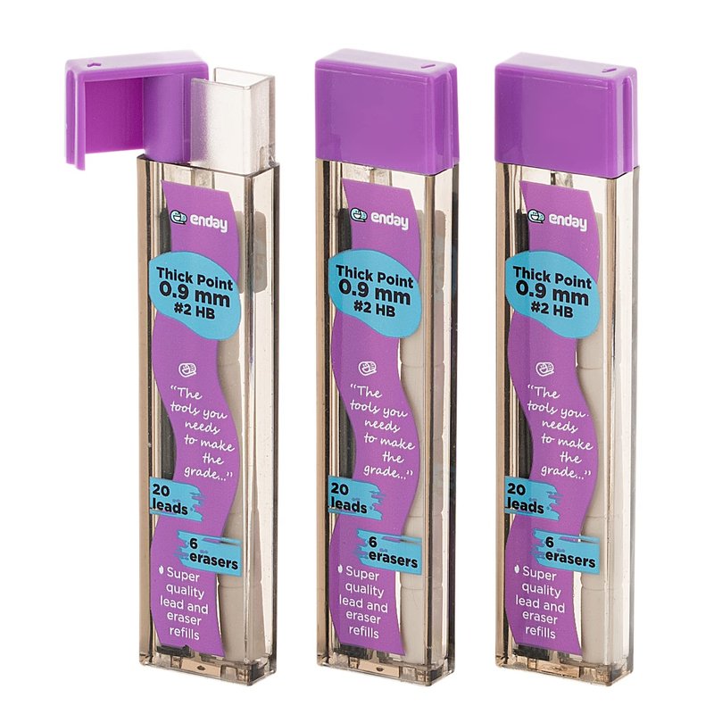 Our 0.9 mm mechanical lead and erasers pencil refills are split in the most convenient way. They are split into 3 separate tubes so they can be used at home, school and office and be kept there for easy accessibility. This lead is reliable and resilient it does not break easily and comes with many pieces. The erasers are soft and erases pristinely without ruining the paper. Their durable and solid make up make them a great option.
