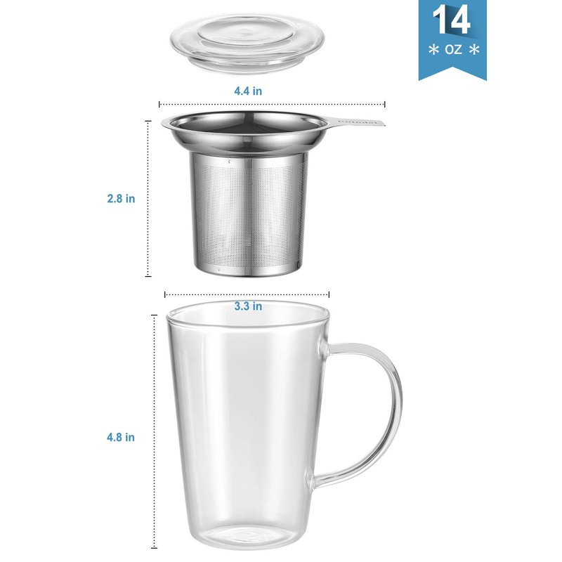 - The tea mug holds 14 oz, it makes just the right amount of tea for one person to enjoy. The glass mug is comprised of three detachable pieces, can be disassembled and cleaned easily, dishwasher and microwave safe.