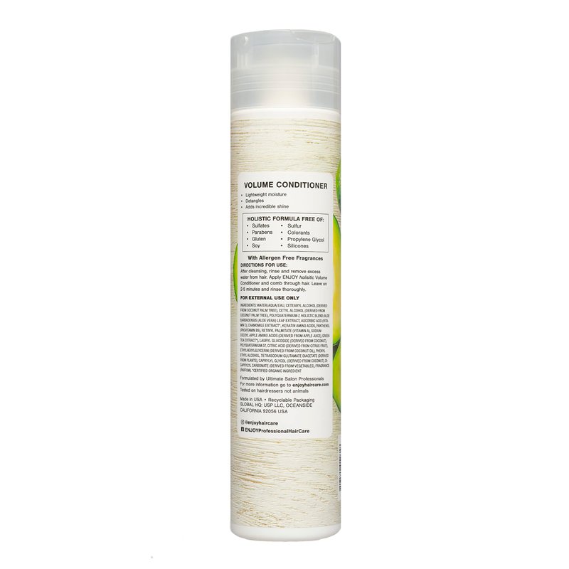 - VOLUME CONDITIONER: This ENJOY conditioner for damaged hair features a color holding formula and has 3.5-4.5 pH balance. Our Holistic Volume conditioner detangles, adds shine and lightweight moisture to fine hair. Available in bottles of 10 Oz. and 33 Oz.