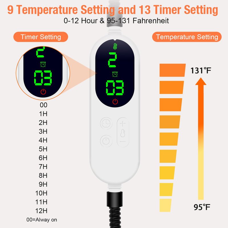 - 【Supports Always-on and 13 Level Timer】This dog heating pads have 13 timer options, always-on (time shows 00), 1-12h auto power off, which can save energy.