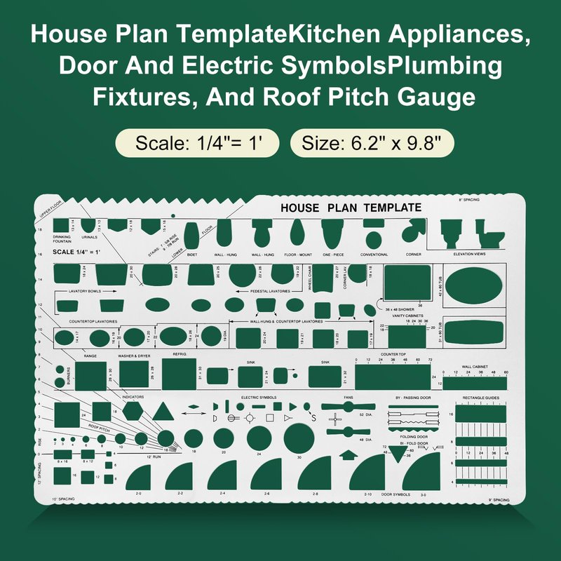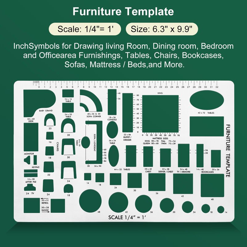- Interior Design Template Set: Includes 3 scaled drafting tools – House Floor Plan (6.2" x 9.8"), Furniture Layout (6.3" x 9.9"), and Kitchen/Bathroom/Bedroom Shape Stencils (8.4" x 11"); 1/4"=1ft scale ensures precision for architects and designers