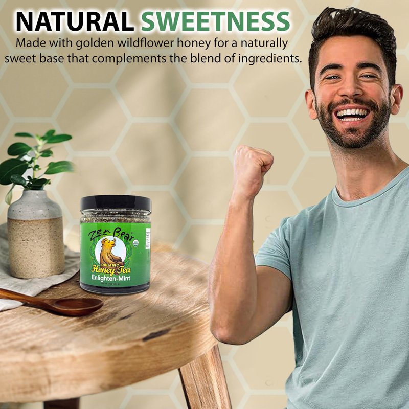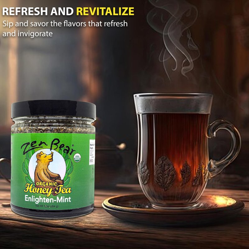 Enlighten Your Senses with Zen Bear's Enlighten Mint Tea Step into a World of Sensory Delight with Zen Bear's Enlighten Mint. This Exceptional Tea Combines the Subtle Essence of Green Tea (Matcha) With the Invigorating Freshness of Spearmint Leaves, All Elegantly Sweetened with Raw Wildflower Honey, Creating a Symphony of Flavors That Elevate Your Tea Experience. Summer Refresher, Winter Comfort Enlighten Mint Isn't Confined to a Season. During the Summer, It's a Refreshing Classic When Served over Ice. Add a Sprig of Mint and a Touch of Lemon for a Delightful Twist on Sweet Iced Tea. When Winter Arrives, Savor the Fresh Spearmint Notes as a Comforting Hot Tea That Warms Your Soul. Pure Ingredients for True Flavor At Zen Bear, We Believe in the Power of Pure Ingredients. Enlighten Mint Embodies This Philosophy, Delivering an Unforgettable Taste Experience That Awakens Your Senses with Each Sip. Your Year-Round Tea Companion Whether You're Seeking a Summer Pick-Me-up or a Winter Indulgence, Enlighten Mint Is Your Versatile Companion. Order Now to Experience the Perfect Balance of Green Tea, Spearmint, and Honey in Every Cup. Elevate Your Tea Ritual with Zen Bear's Enlighten Mint, Where Every Sip Is a Journey to Flavor Enlightenment.