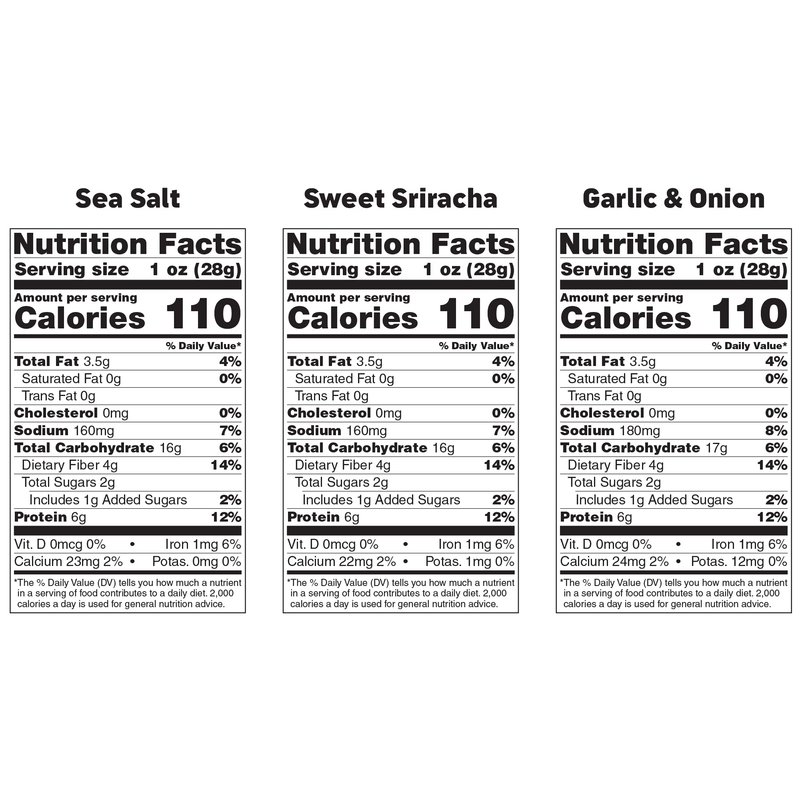 - Our crunchy broad beans offer a satisfying alternative to chips, with only 110 calories per serving, plus 6g of protein and 4g of fiber. We believe that healthy snacking should be a pleasure, not a chore, which is why we've made sure that our dried fava beans taste just as good as they are good for you.