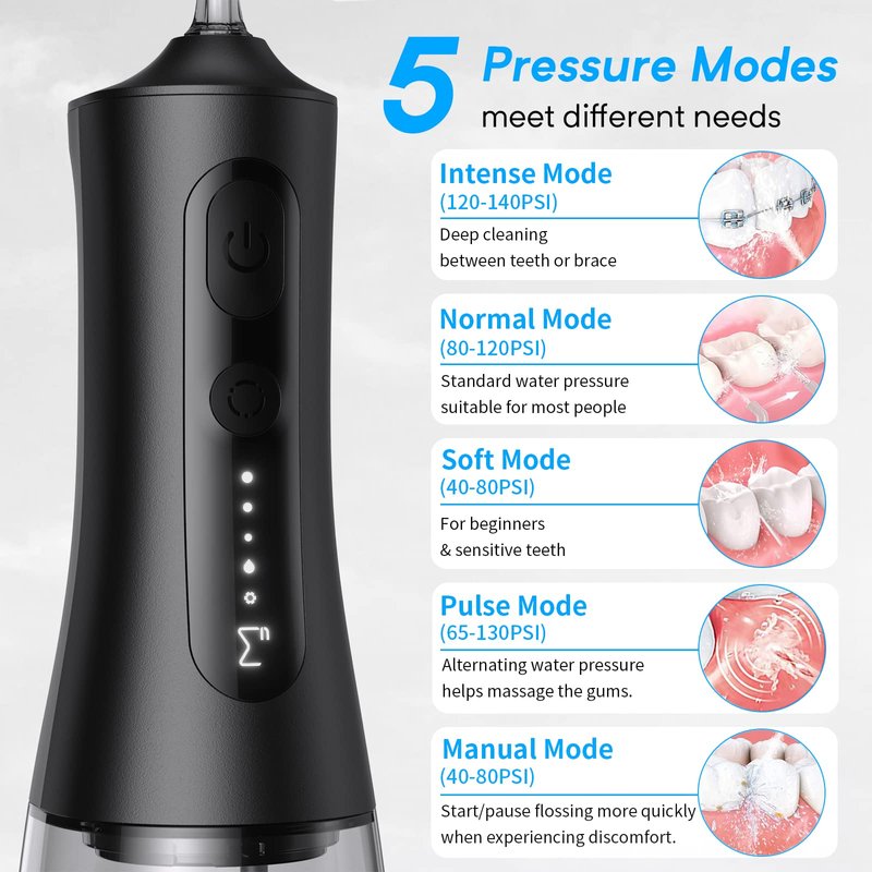- 5 pressure modes for different people. Enpuly water flosser features 4 continuous flushing modes (Intensive/Standard/Soft/Pulse) and a specially designed adjustable manual mode that simultaneously meets the various oral cleaning needs of different people. The many modes allow you to choose the right power for your mouth, providing an efficient and convenient experience for everyone.
