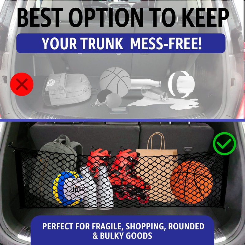 - PERFECT STORAGE SOLUTION - With our trunk net, you can store all your belongings together without worrying about space cluttering, goods rolling around, or liquid spills. Get easy access to things with our car net! No more mess or lost items!
