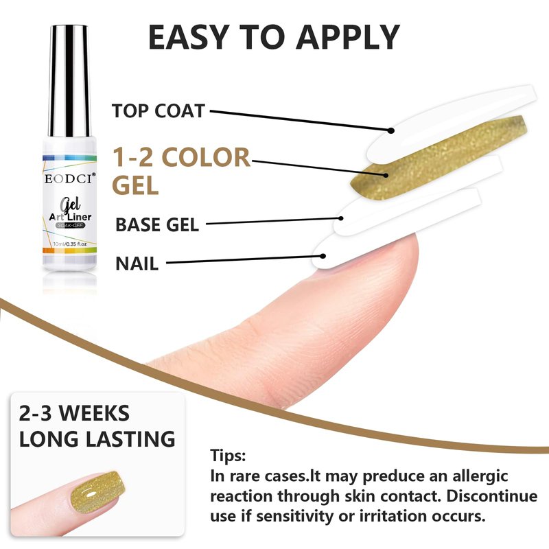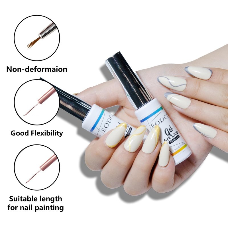 *What You Get liner gel polish*2*Main MaterialMethacrylic acid resinMethacrylate ester monomerMethacryloyl Propyltrimethoxysilane*How to use1. Apply base coat and cure with LED/UV lamp. 2. After the color gel is cured outline the patterns and lines you want with the liner gel. 3. Cure (for 30~60s) to set the pattern and lines. 4. Apply the top coat and cure with nail lamp (for 30-60s). 5. Apply cuticle oil around the cuticle area and massage for a while. 6. Finish. *WarningProfessionally formulated and only used for nails. Avoid contact with eyes, mouth, and skin. In case of contact with them, rinse immediately with water. If there is any incident, contact the doctor.thin brush nail polish