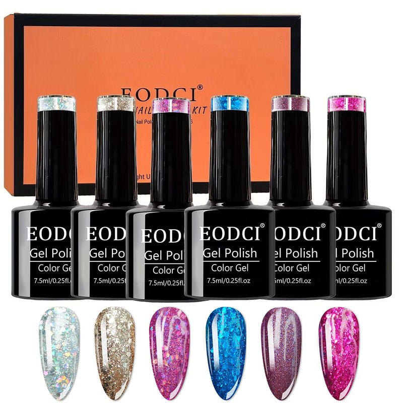 eodci Miami Purple Pink Gel Nail Polish Set, 6 Colors Sparkle Gold Silver Glitter Soak Off Blue Gel Polish Set for Nail Art Home Salon Gel Holiday Manicure Kit Valentine Gift for Women