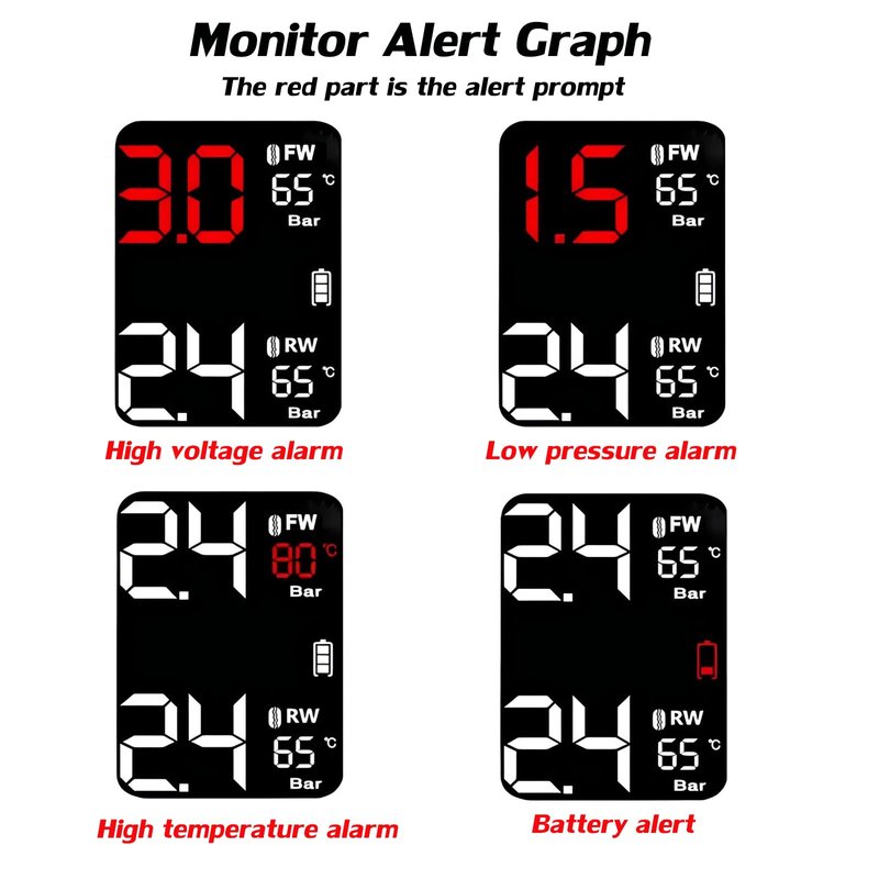 - 【Alarm System for Motorcycle】Leakage warning, Low pressure warning, High pressure warning, High temperature warning, Low power warning, No signal warning, Low power of receiver.