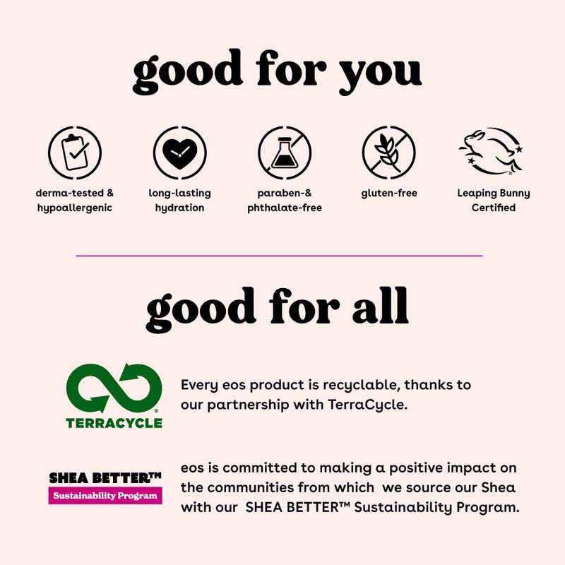 - ALL-NATURAL SHEA BUTTER: eos vegan shave creams have wild grown, sustainably sourced, 100% natural shea butter to make your skin feel moisturized, protected, and soft. eos shave cream + body lotion for dry skin are paraben, phthalate and gluten-free. Leaping bunny certified. No products tested on animals.