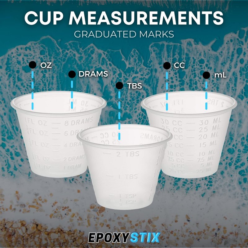 - BANG FOR YOUR BUCK - Each Pack Includes 25 10oz PET Mixing Cups (7.5oz measurements), 100 1 Oz (30ml) Strong Polypropylene Medicine Cups, 25 8" Extra Sturdy Mixing Sticks, 25 Jumbo Applicator Sticks, and Two Pairs of Size Large Nitrile Gloves! Whether You're A Professional Painter, Resin Hobbyist, or Craft Expert, The EpoxyStix Graduated Mixing Cups Are All You Need To Get Started!
