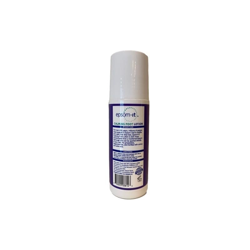 Epsom-It Calming Foot Lotion - 3.0 oz. (90 ml) Harnessing the 400-year history of Epsom Salts in an easy-to-use Epsom Salt foot lotion! Experience the benefits of an Epsom Salt foot bath anytime, anywhere, no tub or foot spa required! The patented and concentrated Epsom-It formula combines 100% pure USP Grade Magnesium Sulfate (the purest form) with natural urea, creating a convenient, unscented Epsom Salt foot gel. It soothes achy feet, and “pins and needles” discomfort, and moisturizes hard, rough skin on the foot and heel. Whether you've been standing on your feet all day, recovering from a workout, a long run, or purely seeking a relaxing moment before bed, simply roll on the Magnesium Sulfate and Urea lotion for feet for instant calm in sensitive feet, muscles, and nerves. Plus, the non-greasy foot care formula absorbs quickly, allowing you to slip into your socks and shoes without leaving behind any residue. How To Use Epsom-It Epsom Salt Rollerball The roll-on Magnesium Sulfate lotion is super easy to apply and ideal for on-the-go support. Keep this Magnesium Sulfate lotion rollerball for leg cramps and sore feet on your nightstand or slip it in your carry-on luggage for quick access. Roll it on affected areas once or multiple times a day as needed. Key Features Targeted achy, tired feet 20% pure USP Grade Magnesium Sulfate – Active ingredient absorbable through the skin Fortified with natural Urea to soften tough skin Paraben-free, greaseless, and odor-free formula that is gentle on skin Not tested on animals Made in the USA Easy to apply - no foot spa or soaking needed Ideal for use before sleep Reclaim Your Freedom of Movement Rediscover the joy of an active lifestyle with this Epsom salt rub. The magnesium lotion is designed to increase relaxation and enhance muscle function by relieving sore and aching muscles and reclaiming comfort in your feet – promoting healthier habits, lifting overall morale, and enhancing life's enjoyment.