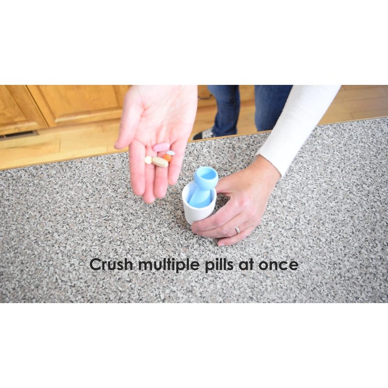 - The fit of the mortar and pestle delimits the pill particles that pass into the jar, and gives you the finest pill powder.