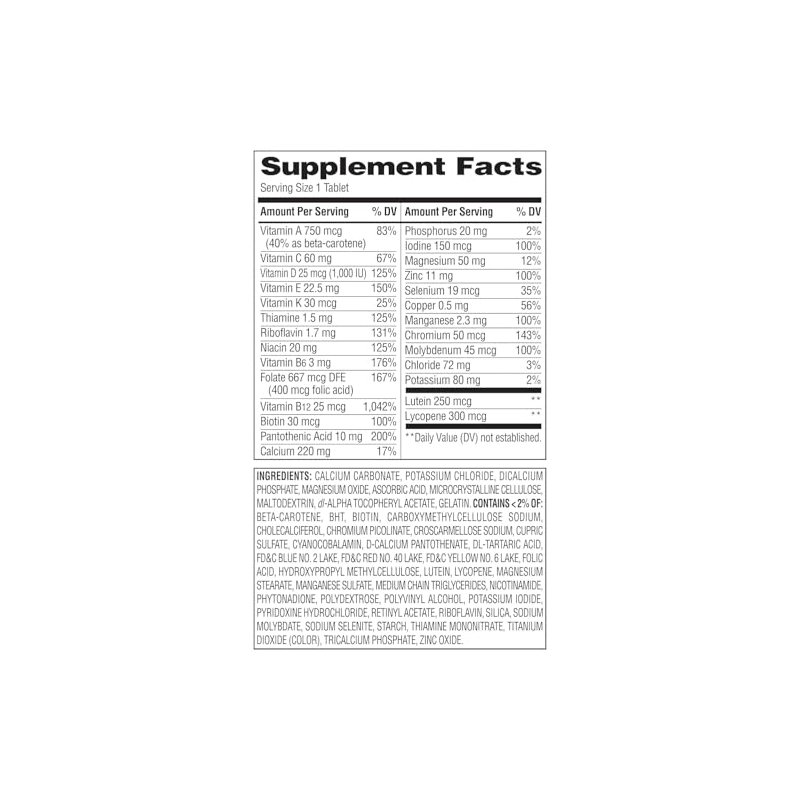 Complete Multivitamin Adults 50+ is formulated with vitamins and minerals to supplement overall nutritional needs for general well-being. A balanced intake of essential vitamins and minerals is necessary for good health.