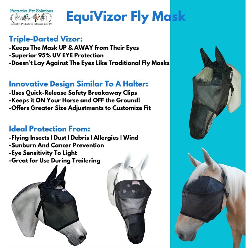 Take the "Horse houdini" challenge. Stop their fly mask disappearing act! A superior patent pending unique design of 3 strategically located darts across the forehead creates a “Vizor” made from a soft EVA lining and a PVC mesh. It lifts and extends the mask up and helps it from collapsing on the eyes. This combined use of EVA lining and mesh not only helps avoid eye injuries but also increases the overall UV eye up to 95%. The combined use of these two materials also insulates the forehead from the heat of the sun and increases shade and ventilation to the eyes. A first of its kind Safety Quick Release Clip System features two adjustable straps (one over the poll behind the ears and one under the throat) along with a Velcro strap under the chin. This not only creates greater size adjust-ability to help fit your horse better, but also helps your horse from removing their mask. Protective Pet Solutions shall not be held liable for any injury to an animal sustained as a result of the proper and reasonable use of our products.